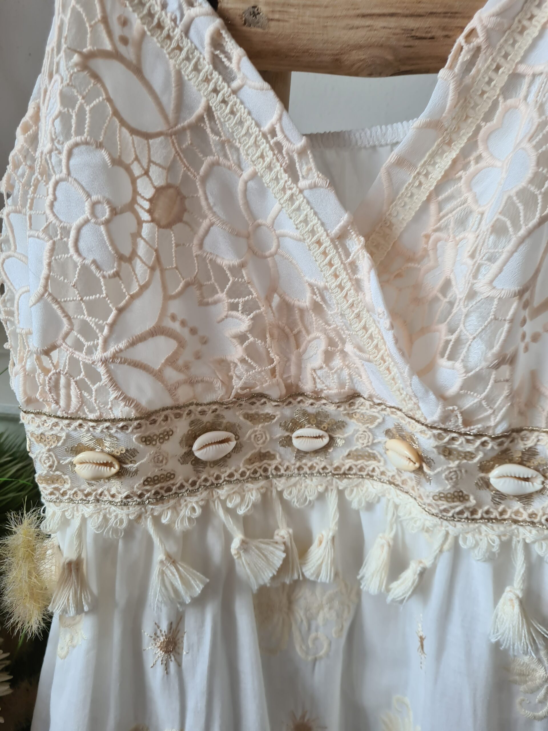 Tauchen Sie ein in die Welt der italienischen Mode mit diesem eleganten Bohokleid, das durch seine liebevollen Details und hochwertige Verarbeitung besticht. Perfekt für den Sommer und viele besondere Anlässe.